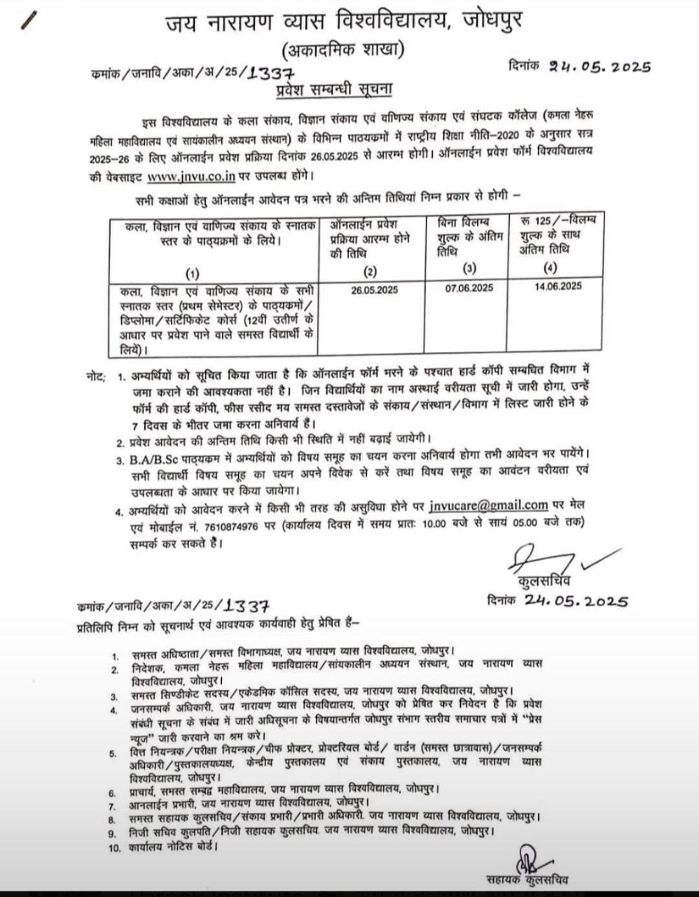 | JNVU D Pharma 1st Semester Admission Form 2025-26 Last Date With Late Fees | 21th June 2025 |